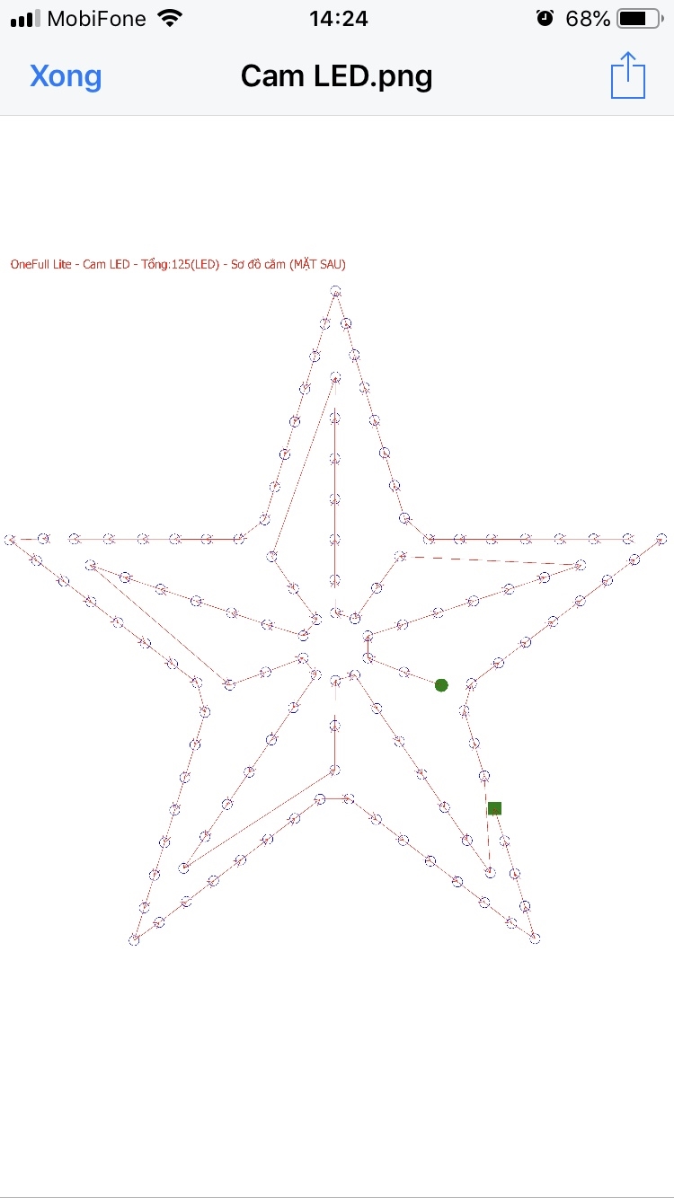 Phác thảo của ngôi sao 5 cánh: cao khoảng 50cm. Khi lấy mạch full sẽ cho kèm theo sơ đồ cắm bóng, các bạn nhớ cắm bóng đúng thứ tự vẽ của 125 con led F8 full màu IC trên sơ đồ nhé - điểm led số 1 sẽ tương ứng với vị trí chấm tròn, điếm led 125 sẽ tương ứng với vị trí chấm hình vuông trên sơ đồ cắm led. Và đừng quên xác định đúng chiều input, output của dây Data trên dây led nhé. Lưu ý: - mạch full khi chạy tính đúng theo điểm pixel led nhé nên khách dùng phải căn đúng cái sơ đồ cắm dây tổng 125 điểm led full - sơ đồ cắm dây mình sẽ cung cấp, khách chú ý chọn đúng chủng loại led full IC tương thích với phần code khi yêu cầu mình xuất file nạp mạch nhen.