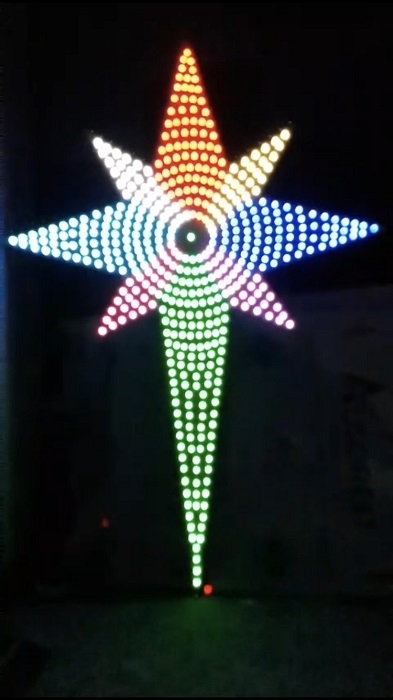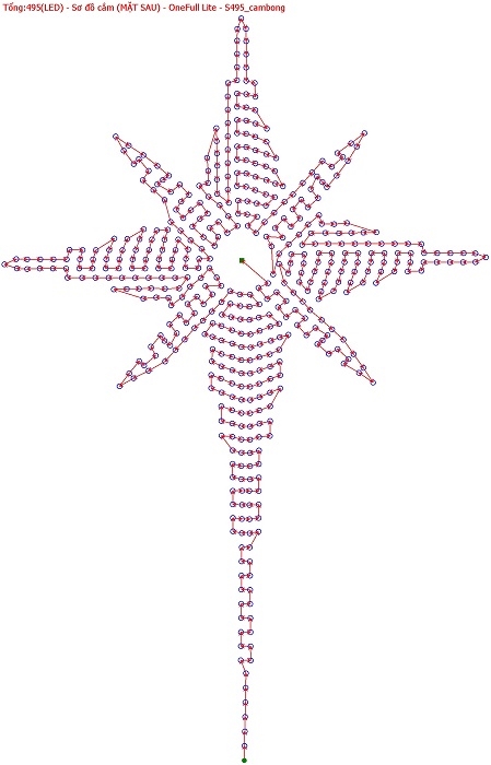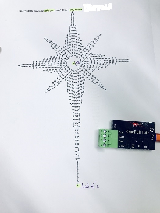 Phác thảo của ngôi sao 8 cánh: phần thân cao khoảng 2m3, ngang khoảng 1m4. Khi lấy mạch full sẽ cho kèm theo sơ đồ cắm bóng, các bạn nhớ cắm bóng đúng thứ tự vẽ của 495 con led F8 full màu IC trên sơ đồ nhé - điểm led số 1 sẽ tương ứng với vị trí chấm tròn, điếm led 495 sẽ tương ứng với vị trí chấm hình vuông trên sơ đồ cắm led. Và đừng quên xác định đúng chiều input, output của dây Data trên dây led nhé. Lưu ý: - mạch full khi chạy tính đúng theo điểm pixel led nhé nên khách dùng phải căn đúng cái sơ đồ cắm dây tổng 495 điểm led full - sơ đồ cắm dây mình sẽ cung cấp, khách chú ý chọn đúng chủng loại led full IC tương thích với phần code khi yêu cầu mình xuất file nạp mạch nhen.