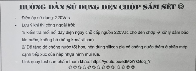 1/ kiểm tra mối nối dây điện ngay chỗ cấp nguồn 220Vac cho đèn chớp à xử lý đảm bảo kín nước, không hở (băng keo/ silicon)
