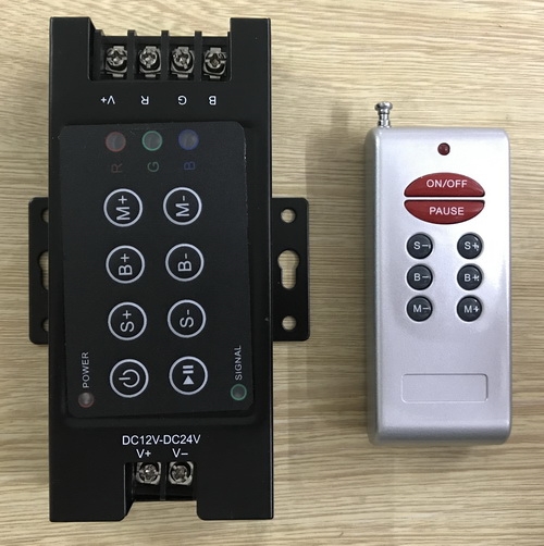 Có remode đi kèm, điều khiển bằng sóng RF nên có ưu điểm hơn các bộ điều khiển RGB dùng mắt hồng ngoại là có thể chỉnh được khoảng cách xa hơn, xuyên được tường