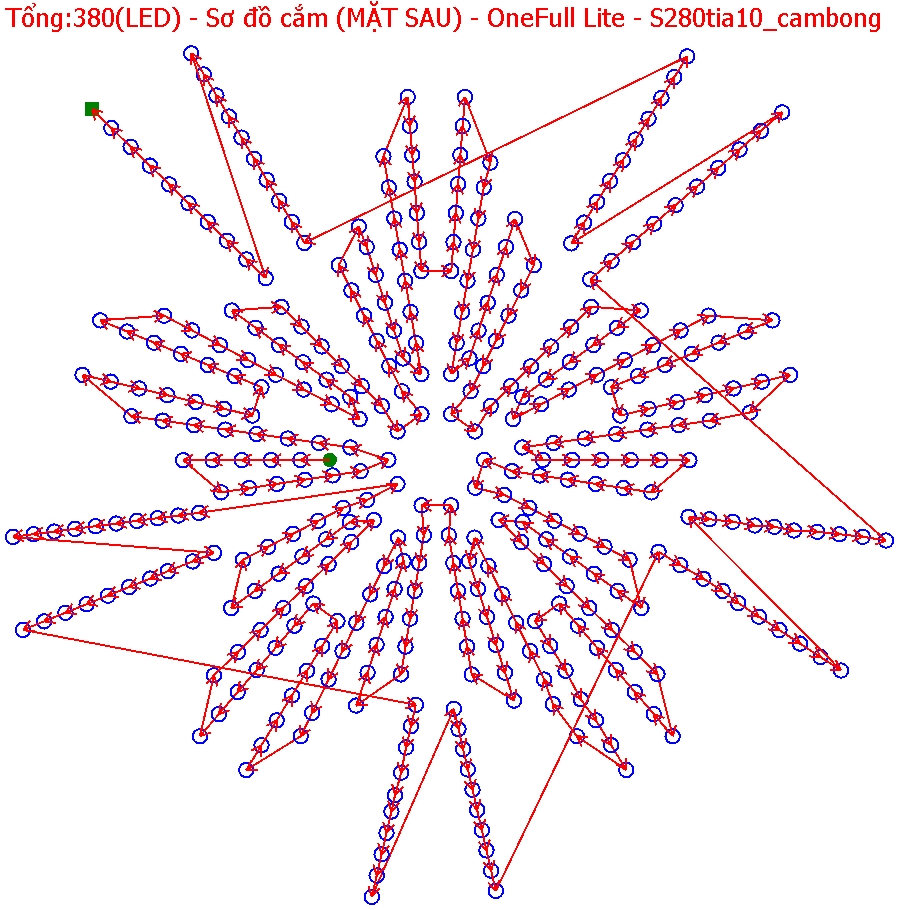 ● Sơ đồ cắm bóng sẽ đi từ led 01 đến led 280 (tương ứng phần thân ngôi sao), sau đó đi tiếp phần tia từ led 281 đến led 380. Cho nên có thể thi công mỗi phần thân sao 280 bóng, không cần làm tia cũng được (hiệu ứng trong video sẽ không có phần tia thôi nếu cắm bóng mỗi phần thân sao).