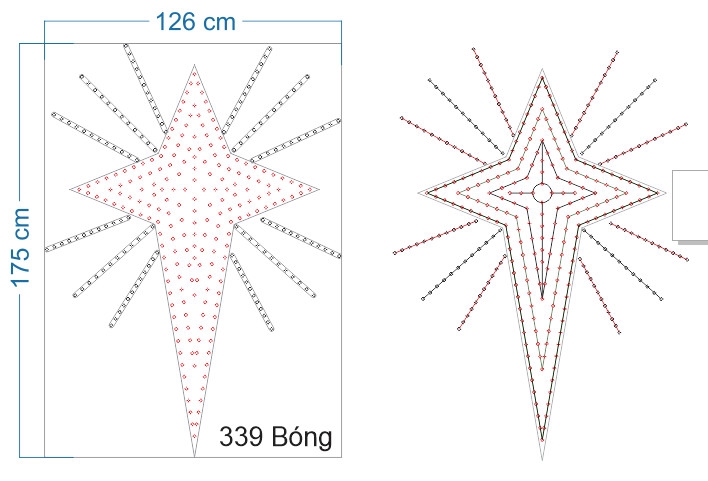 * Phác thảo của ngôi sao: cao khoảng 1m77, ngang 1m24 tùy theo xê xích cắm led, tâm led -tâm led khoảng 3 cm.