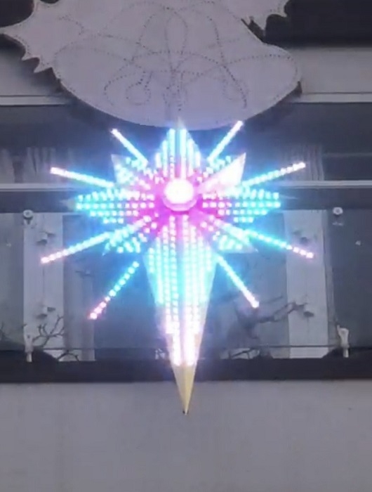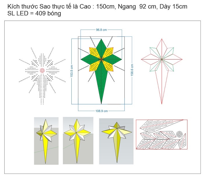 ● Phác thảo của ngôi sao 3D 409 led: kích thước cao khoảng1500mm, ngang 920mm, cao 150mm (nếu F8 fullcolor phân bổ cắm bóng tâm led -tâm led khoảng 3 cm theo bản vẽ, còn tuỳ theo khách về làm thực tế muốn tự điều chỉnh xê xích cắm bóng giãn ra co lại thì có thể tăng giảm kích thước ngôi sao 1 chút nhé).