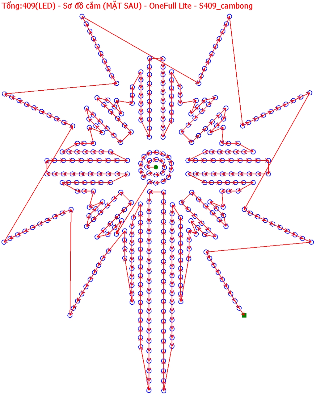 ● Khi mua mạch full sẽ cho kèm theo sơ đồ cắm bóng, các bạn nhớ cắm bóng đúng thứ tự vẽ của 409 con led F8 full màu IC trên sơ đồ nhé - điểm led số 1 sẽ tương ứng với vị trí chấm tròn, điếm led 409 sẽ tương ứng với vị trí chấm hình vuông trên sơ đồ cắm led. Và đừng quên xác định đúng chiều input, output của dây Data trên dây led nhé.