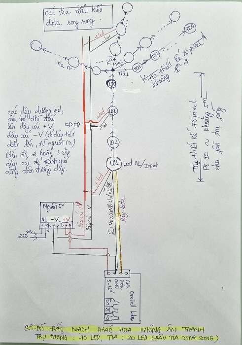 * Mạch sử dụng chung sơ đồ đi led như sau: Đầu vào là điểm đầu của đuôi phóng, các bóng được đấu nối tiếp đến tia, phần trụ gồm 70 bóng led fullcolor. Các tia đấu song song chung đầu vào Data, mỗi tia 20 bóng led fullcolor.