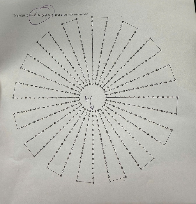 ● Khi mua mạch full sẽ cho kèm theo sơ đồ cắm bóng, các bạn nhớ cắm bóng đúng thứ tự vẽ của 512 con led F8 full màu IC trên sơ đồ nhé - điểm led số 1 sẽ tương ứng với vị trí chấm tròn, điếm led 512 sẽ tương ứng với vị trí chấm hình vuông trên sơ đồ cắm led. Và đừng quên xác định đúng chiều input, output của dây Data trên dây led nhé.